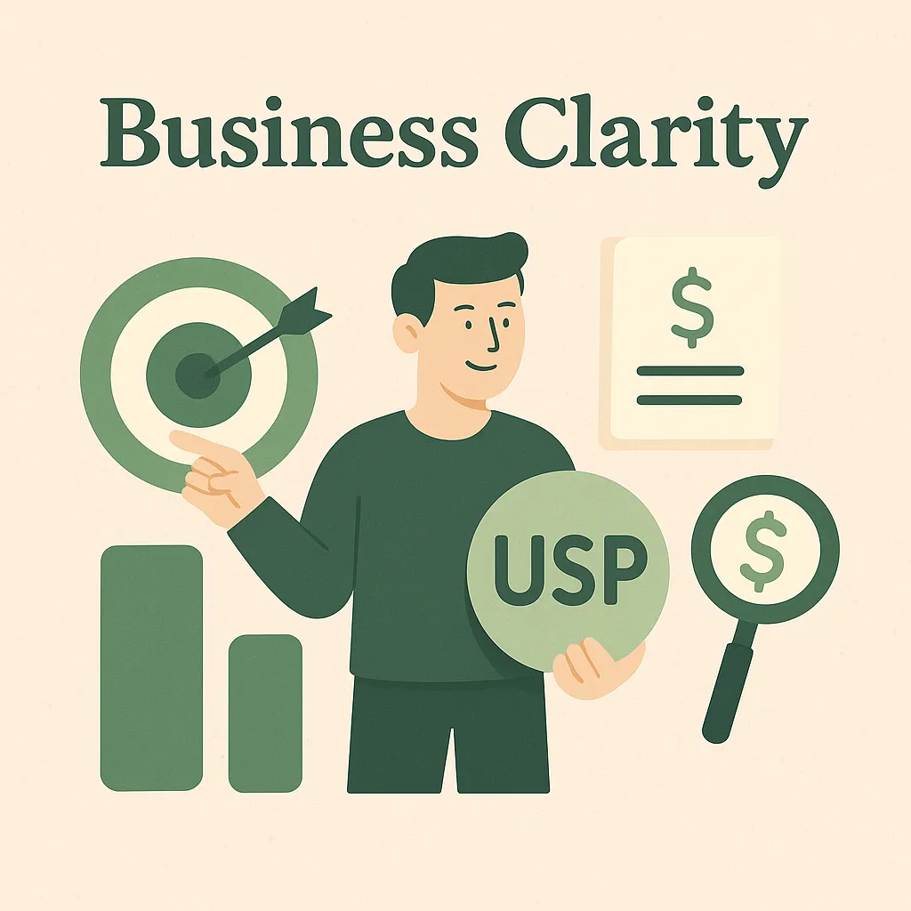 Investment needed, discovering passion, target customer, USP, competition analysis, and quick sales diagnosis. Includes a Business Clarity Worksheet.